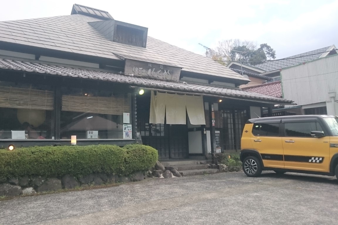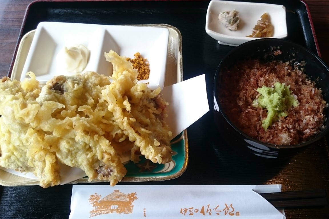 伊豆市はわさびが有名ならしいのでこちらのお店で鹿の天ぷらとわさび丼のセットを注文しました。