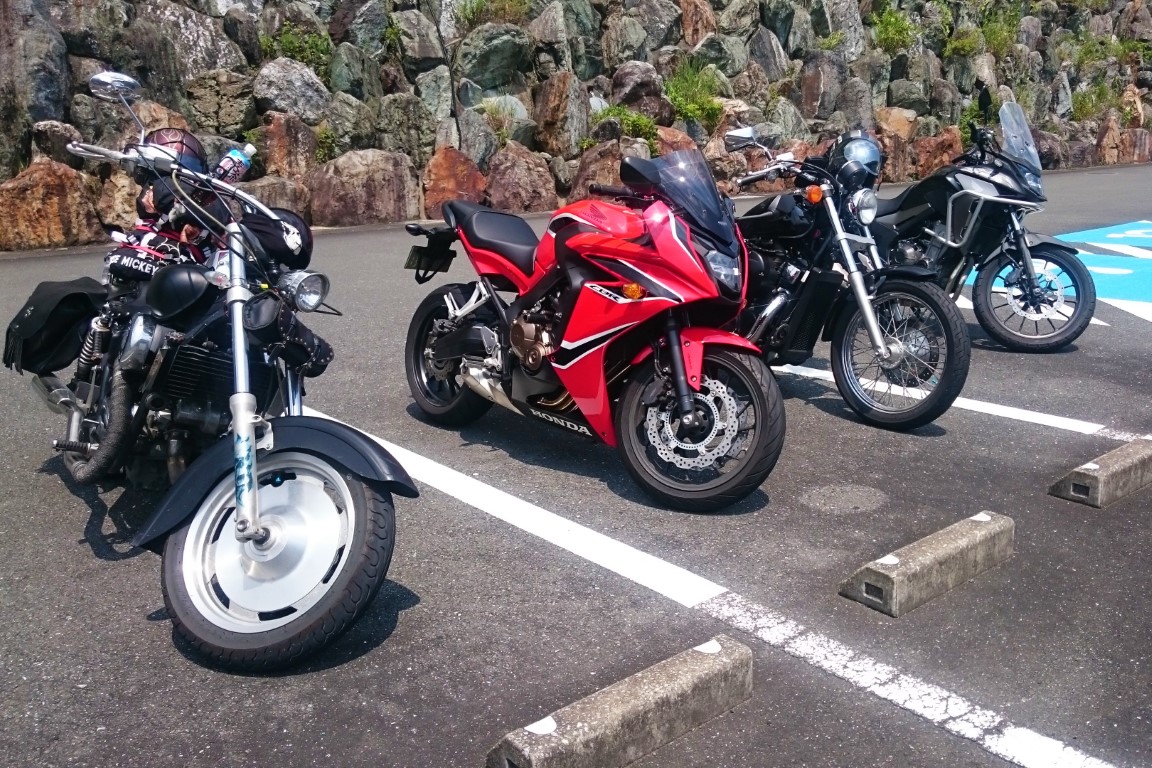 手前のVツインマグナ250が神戸のライダーのバイクで、その奥の2台が2人組のライダーのバイク、1番奥にある400Xが私のバイクです。