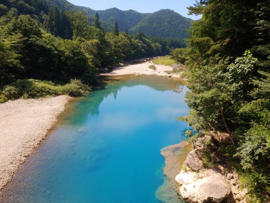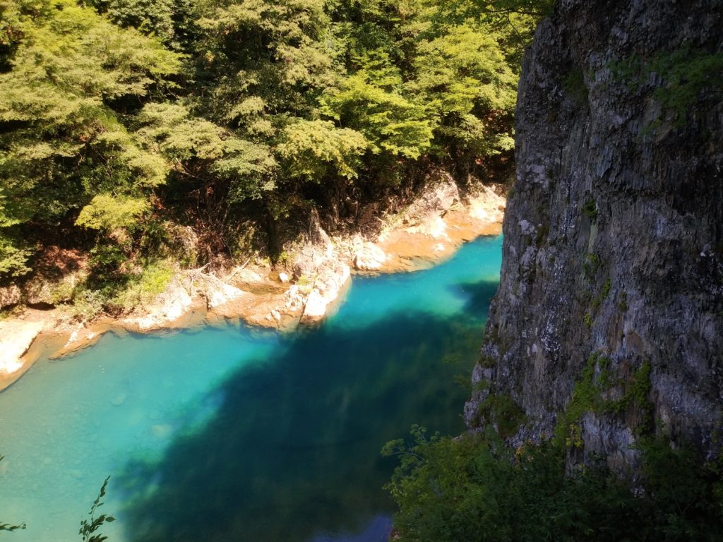 駐車場にバイクを停めて遊歩道を歩くとそこには神秘的な光景が広がっていて、国指定の特別名勝であり天然記念物でもある渓流の透明感には感動しました。