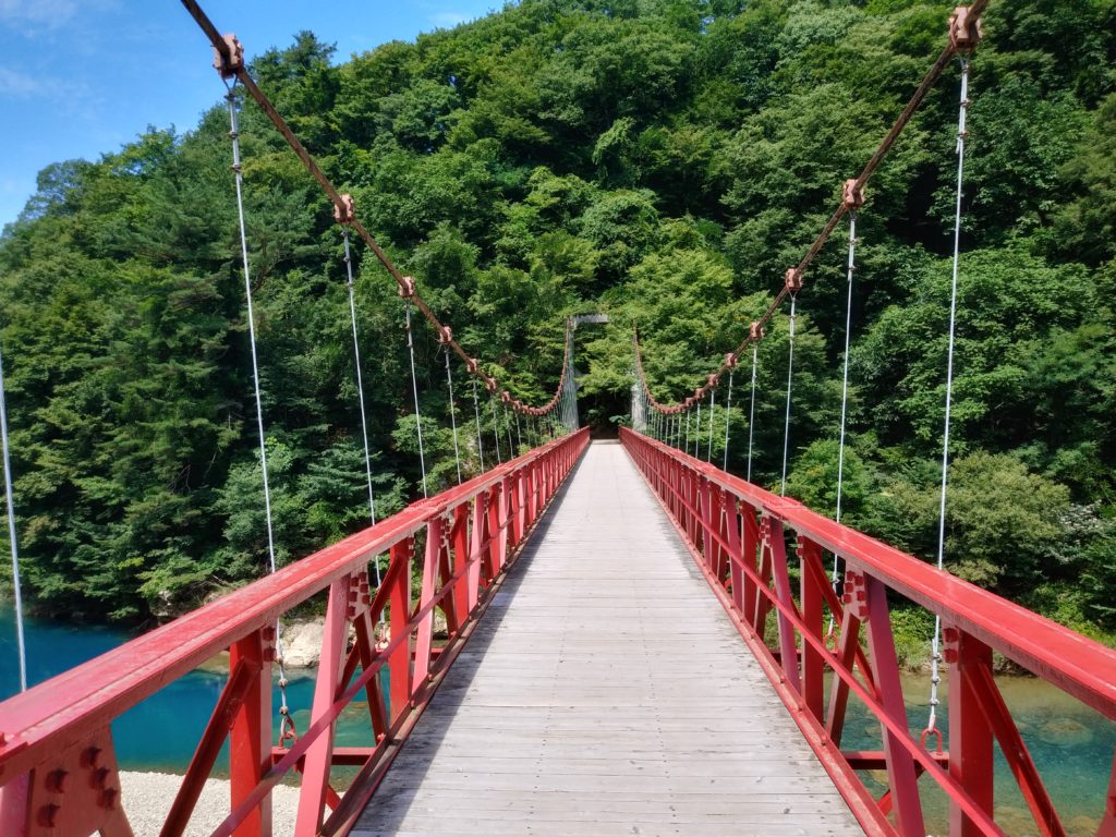 橋を渡ってこの渓谷の先にある滝を目指しハイキング。