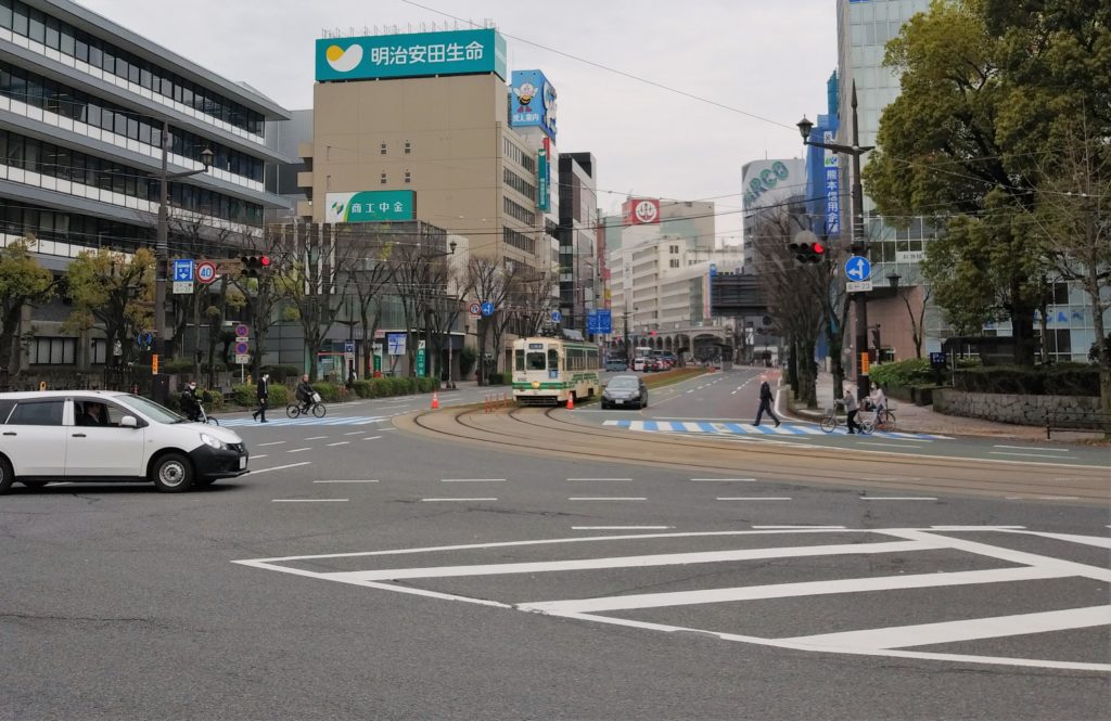 路面電車が走る交差点を見ると九州に来たって感じがします。