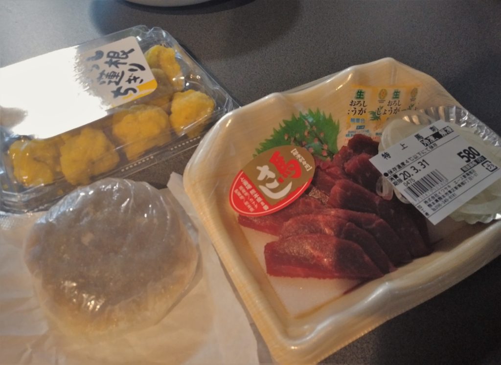 宿に戻ると馬刺しなどが置いてありました。