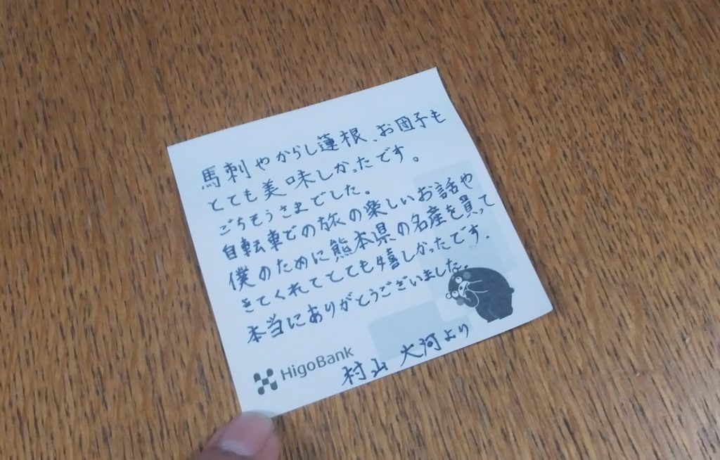 「若い時に旅をしてるとお金とかに気を使って美味しいものも食べないでその土地を離れてしまうことが多いと思うから、スタッフとしてではなく同じ旅人として君に熊本県の名物を明日の夜に渡すね。」と言いました。