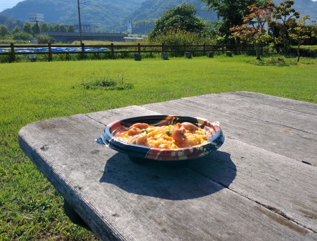 駐車場で食べるのもなんなんで、少し歩いたところにテーブルとベンチがあったのでのどかな景色を眺めながら食べることにします。