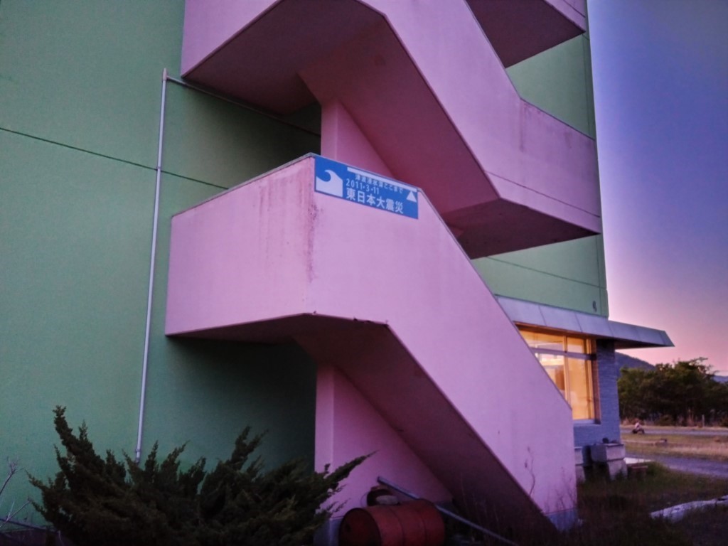当時、津波が押し寄せてきて青いプレートがある一階の階段部分まで浸水したそうす。