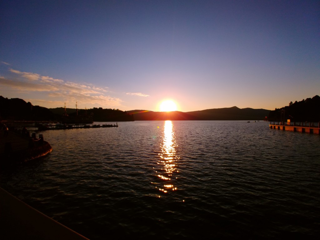 澄んだ冷たい空気と芦ノ湖から見る夕日。