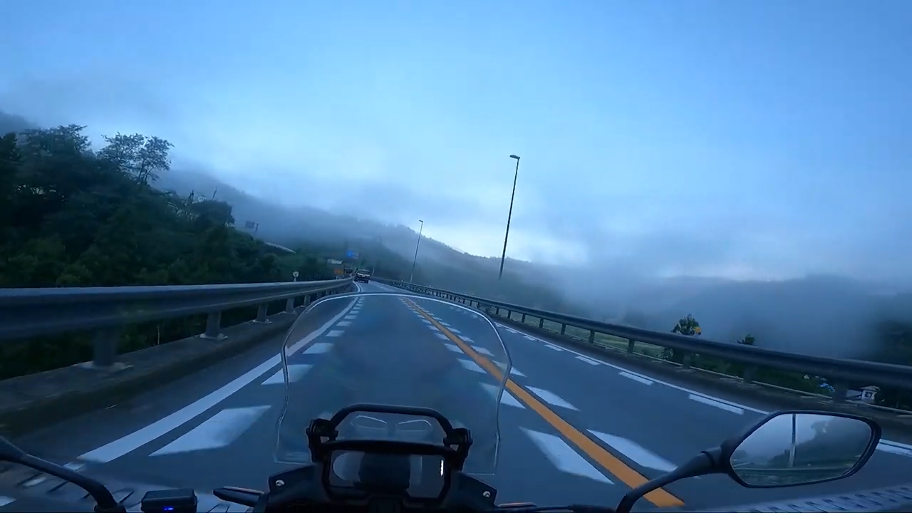 国道246号線の霧がかった景色と遠くの山々に趣を感じます。